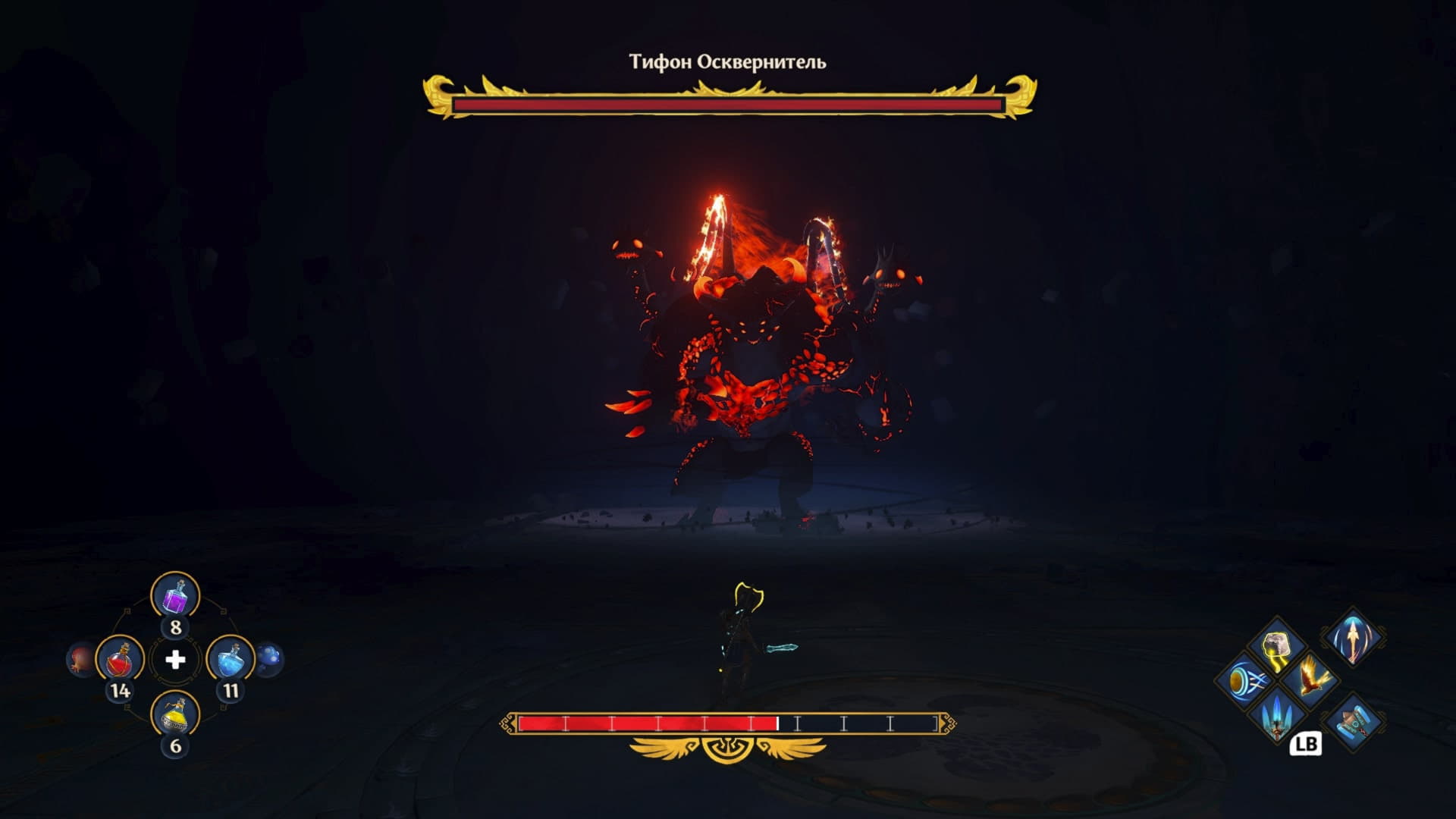 Бой окажется на удивление не сложным. Старайтесь держаться позади босса и наносите удары топором в воздухе. Также хорошо помогут атаки Фосфора и иногда лук. Обратите внимание, что Тифона нельзя оглушить (однако полоска жизни у него тает довольно быстро).